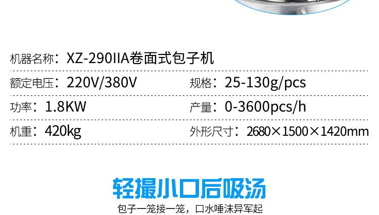 名稱XZ-290IIA卷面式包子機(jī) 電源220/380V(見機(jī)器名牌) 功率1.8kw 產(chǎn)量0-3600個/小時 尺寸2680*1500*1420mm(包括輸送帶) 重量420kg 規(guī)格25-130克/個 其他