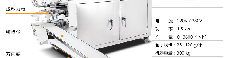 名稱XZ-290III卷面式包子機(jī) 電源220/380V(見(jiàn)機(jī)器名牌) 功率2.4kw 產(chǎn)量0-3600個(gè)/小時(shí) 尺寸2050*1470*1480mm(包括輸送帶) 重量400kg 規(guī)格25-130克/個(gè) 其他