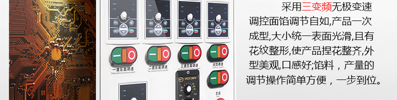 ?三變頻無(wú)極變速調(diào)控,生產(chǎn)速度、制品大小、內(nèi)餡含量及生產(chǎn)產(chǎn)量皆可隨意調(diào)控;