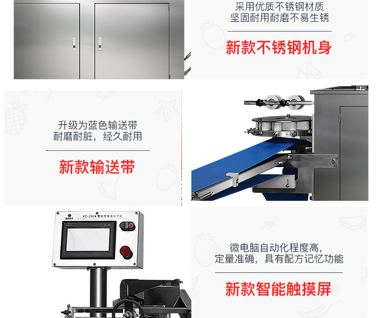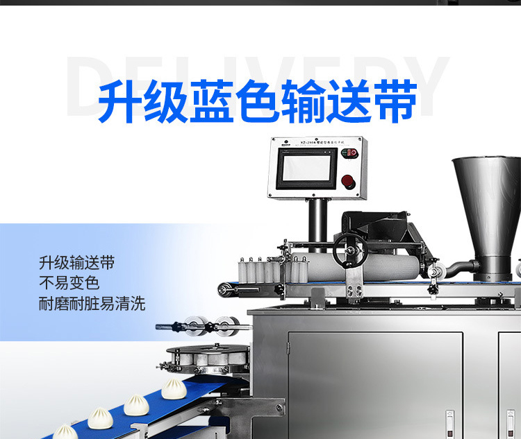XZ-290A智能型卷面式包子機是一款以壓面方式成型面皮,卷面方式包餡,仿手工捏花的一款機型,它整合了原有的二道壓面、成型機、出餡機、切刀為一體,有操作方便、占地面積小等優(yōu)點。該機采用壓面成型面皮的方式,表面光潔,不傷面筋,不發(fā)熱,使產品口感滑順爽口,保持傳統手工工藝的風味,本機采用自動控制系統,品質穩(wěn)定,壓面滾筒采用性能好的食品級材料UPE加工而成,且增大了滾簡直徑使得在壓面過程中面皮的精度更高,產品重量精度更高,規(guī)格,長度,大小,面皮的厚度皆可調整設定。