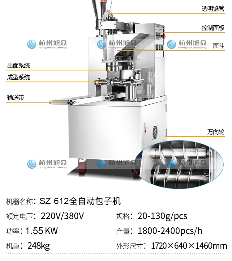 SZ-612全自動(dòng)包子機(jī),22800元(不含運(yùn)費(fèi)不含稅價(jià)格),SZ-612型全自動(dòng)包子機(jī)是一款設(shè)計(jì)先進(jìn),結(jié)構(gòu)簡(jiǎn)單,操作方便,生產(chǎn)性能穩(wěn)定的設(shè)備。其體積小重量輕,外殼主要部件采用不銹鋼制作,外觀精美。