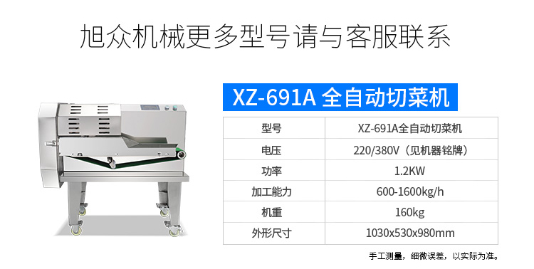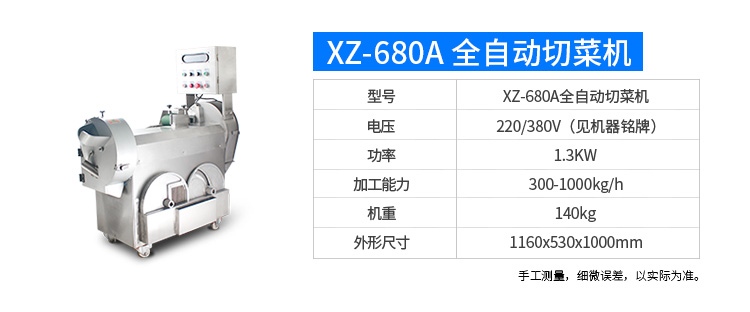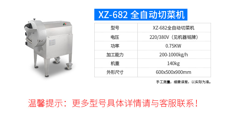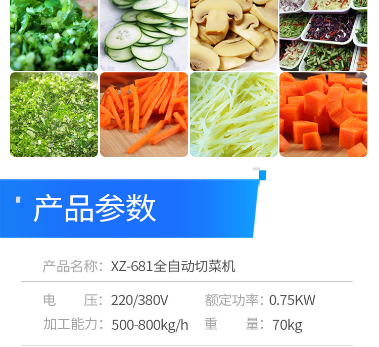 名稱XZ-681多功能切菜機 電源220/380V(見機器銘牌) 功率0.75kw 產(chǎn)量500-800千克/小時 尺寸770*460*1400mm 重量70kg 規(guī)格 其他