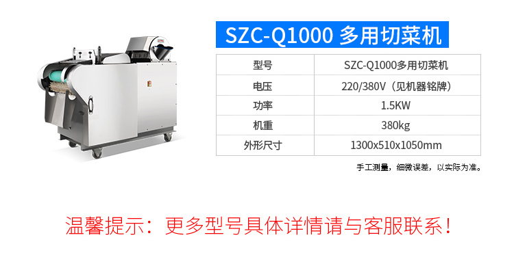 名稱XZ-682多功能切菜機(jī) 電源220/380V(見機(jī)器銘牌) 功率0.75kw 產(chǎn)量200-1000千克/小時(shí) 尺寸770*460*800mm 重量140kg 規(guī)格標(biāo)配刀具尺寸:切絲:3mm,切片:3mm,切?。?0*10mm??蛇x的刀具尺寸:切絲:4、5、6mm 其他