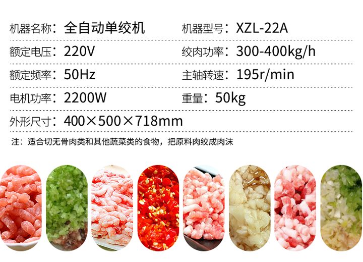名稱XZL-22A絞肉機(jī) 電源220V 功率2.2kw 產(chǎn)量300-400kg/h 尺寸400×500×718mm 重量50kg 規(guī)格 其他