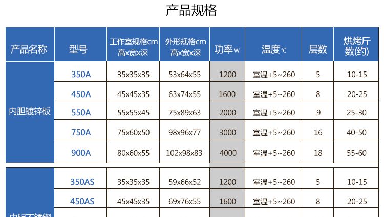 產(chǎn)品名稱 | 型號(hào) | 工作室規(guī)格cm | 外型規(guī)格mm | 電壓 | 功率 | 溫度 | 層數(shù)/斤(約) |