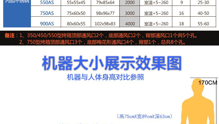 注:1、350/450/550型烤箱頂部通風(fēng)口2個(gè),底部通風(fēng)口2個(gè),背部通風(fēng)口1個(gè)共5個(gè)孔