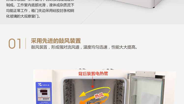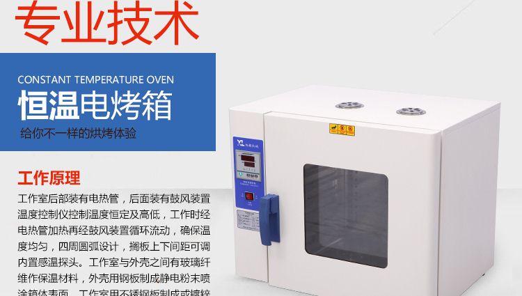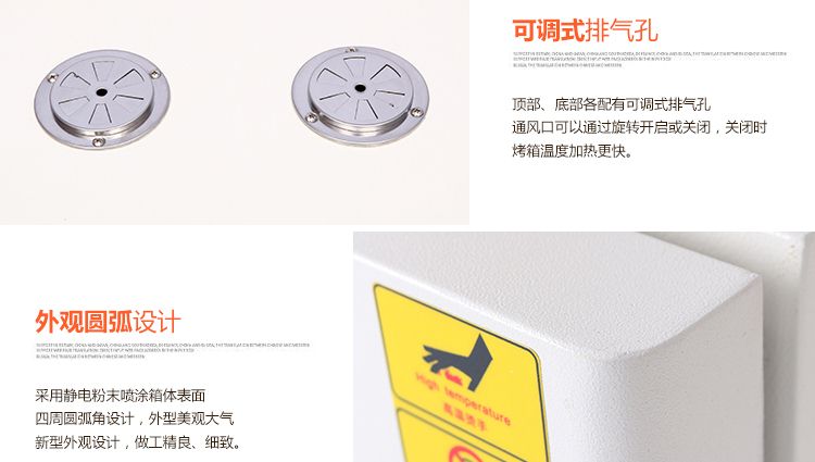 本系列烤箱在工作室后部裝有發(fā)熱管,后面裝有鼓風(fēng)裝置,溫度控制儀控制溫度恒定及高低,工作時(shí)經(jīng)發(fā)熱管加熱再經(jīng)鼓風(fēng)裝置循環(huán)流動(dòng),確保溫度均勻,四周圓弧設(shè)計(jì),擱板上下間距可調(diào),內(nèi)置感溫探頭。