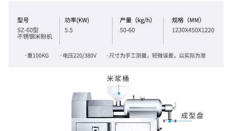 名稱SZ-60不銹鋼米粉機(jī) 電源220/380V 功率5.5kw 產(chǎn)量50-60kg/h 尺寸1230*450*1220mm 重量100kg 規(guī)格 其他