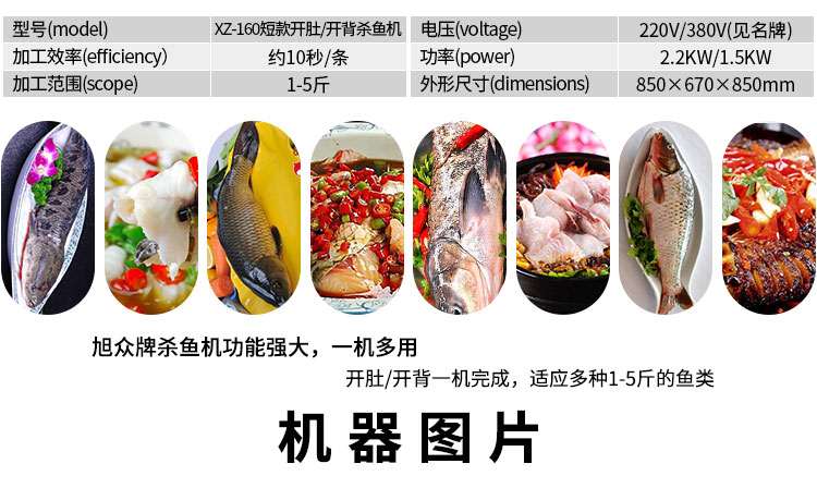 名稱(chēng)XZ-160短款開(kāi)背/開(kāi)肚機(jī) 電源220V/380V 功率2.2KW/1.5KW 產(chǎn)量約10秒/條 尺寸850×670×850mm 重量 規(guī)格1-5斤 其他