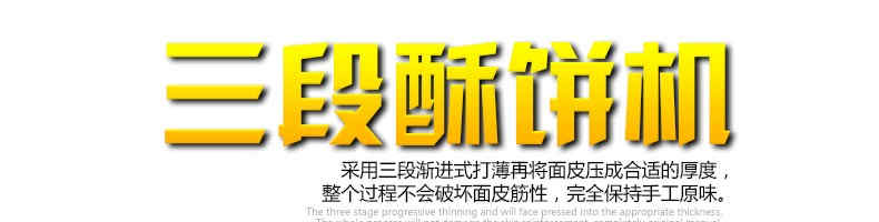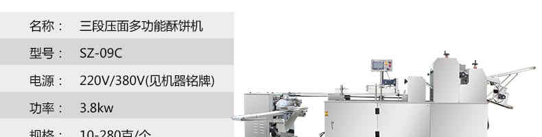 名稱SZ-09C三段壓面酥餅機 電源220/380V(見機器名牌) 功率3.8kw 產(chǎn)量0-3600個/小時 尺寸3200×840×1630mm 重量700kg 規(guī)格10-100克/個 其他