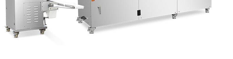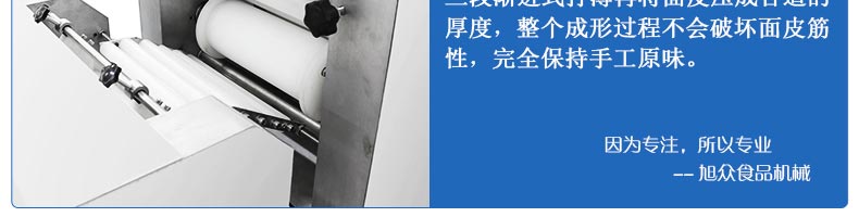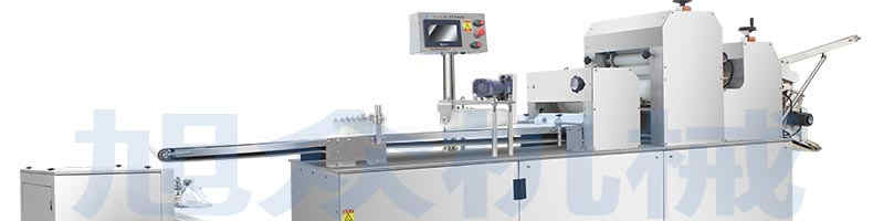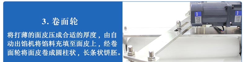 旭眾牌SZ-09C多功能三段酥餅機采用三段漸進式打薄再將面皮壓成合適的厚度。由自動出餡機將餡料充填至面皮上,經(jīng)卷面輪將面皮卷成圓柱狀,最后以成型刀具切割成球狀。長條狀餅胚,整個成形過程不會破壞面皮筋性,保持手工原味。