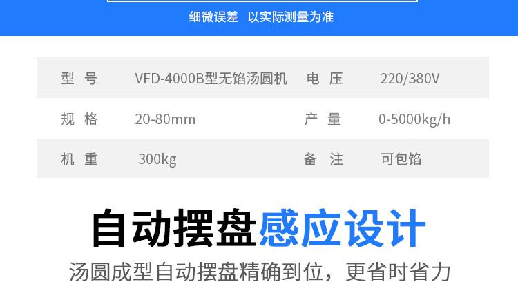 名稱VFD-4000B型湯圓自動成型排盤機 電源220/380V 功率4.5kw 產(chǎn)量0-5000個/h 尺寸1500×1000×1680mm 重量900kg 規(guī)格5-80g/個 其他