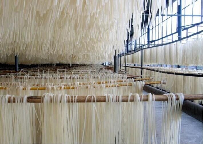 取大米60斤用凈水浸泡1-2小時,用手一搓就爛就可磨成米漿(也可將大米浸泡30分鐘,然后陰干表面水分磨成米粉,再用米粉調(diào)成米漿)。筋力源0.8斤與40斤淀粉干拌勻,加入米漿和勻,補(bǔ)充水分至總量45斤,和面糊至自然攤開為準(zhǔn)。然后將和好的面糊放入自熟米線機(jī)擠絲、風(fēng)扇降溫,再放入涼棚熟化8-12小時、用水浸泡20-50分鐘,然后搓散、陰干表面水分、包裝、銷售。