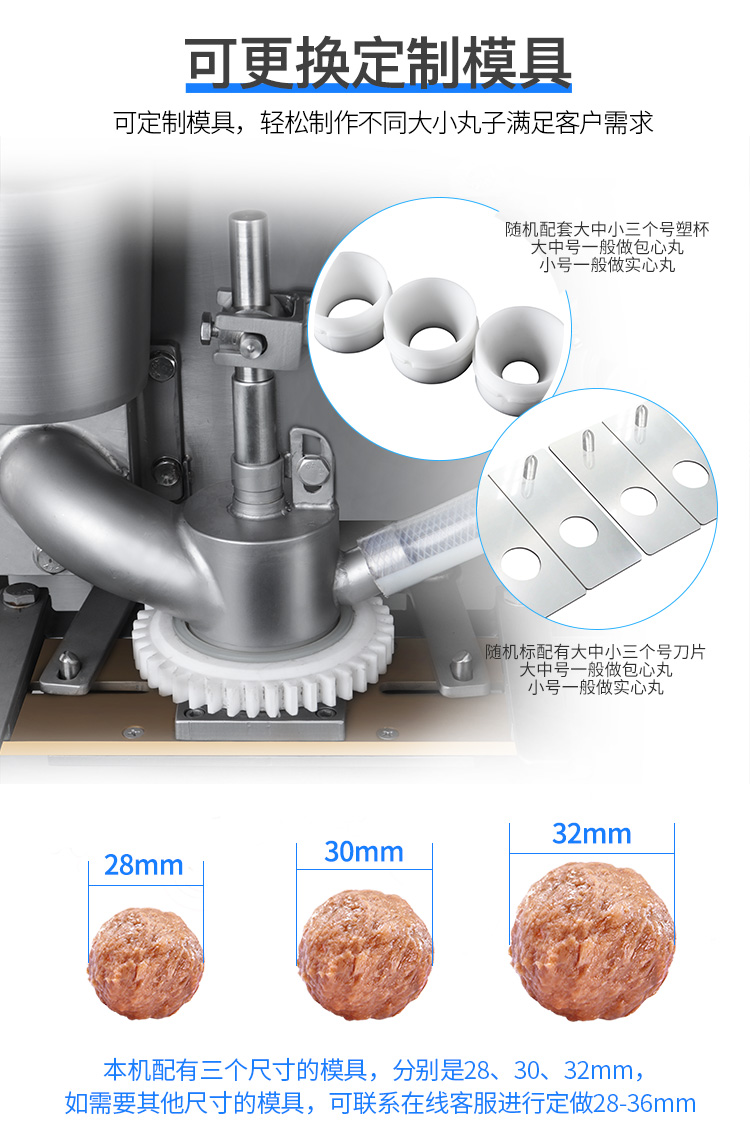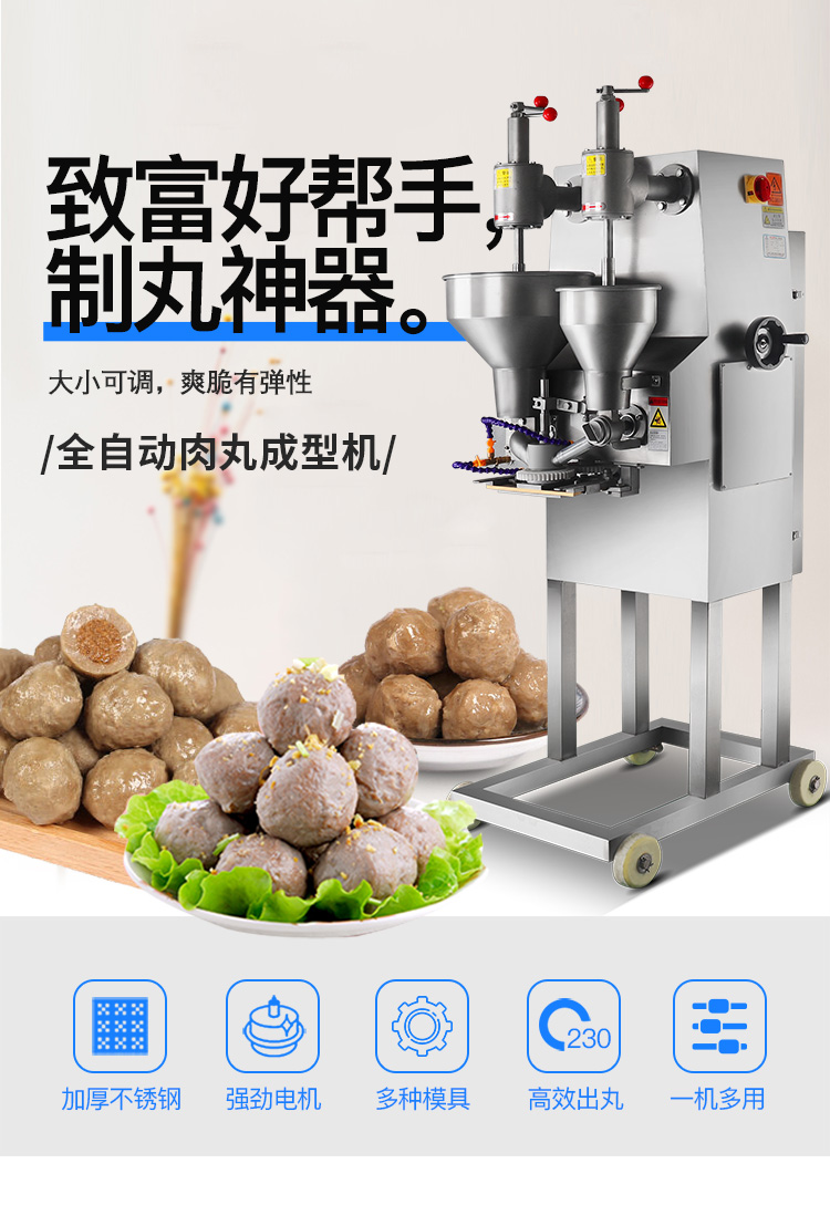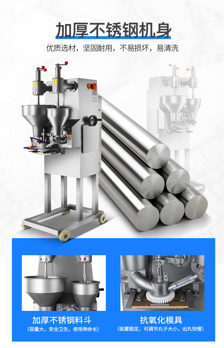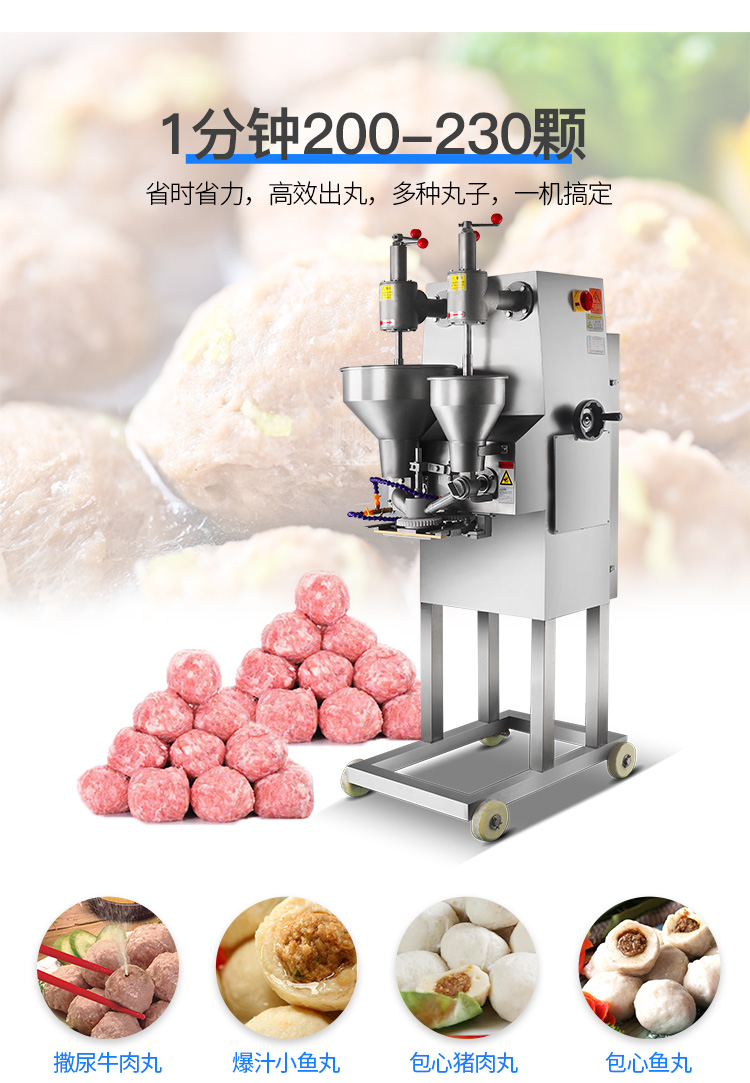 肉丸成型機(jī)為包餡肉制品成丸設(shè)備,能生產(chǎn)出各種大小尺寸的包餡魚丸、撒尿牛丸、豬肉丸、牛肉丸、及包餡貢丸等,并可做不包餡的各類丸子。該設(shè)備具有速度快、衛(wèi)生方便、易拆洗等特點(diǎn),可代替幾十個(gè)人手工生產(chǎn),可為廠家節(jié)省人員的投入、提高生產(chǎn)速度。