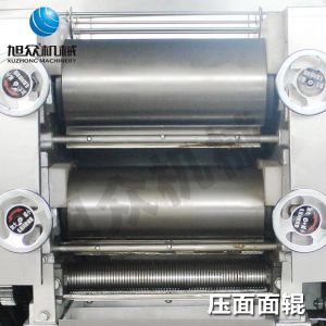 將攪拌好的面粉均勻的放進(jìn)去,面對(duì)輥將松散的面粉初壓成面皮,合皮部分有一對(duì)軋輥,它將兩層復(fù)合面皮合成一層,延軋部分由兩對(duì)軋輥組成,將面皮軋成所需的厚度,切條部分是將一定厚度的面皮切成所需寬度的面條,上門(mén)架部分把切斷后的面條自動(dòng)挑起。
