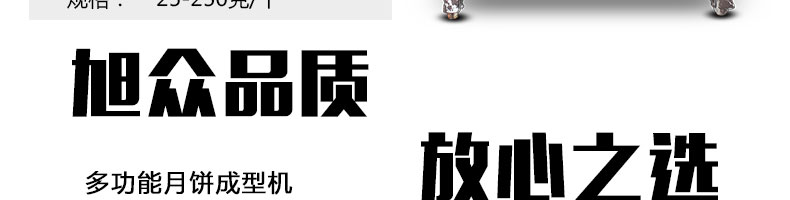 旭眾牌SZ-64型月餅自動成型機是一款多功能的設(shè)備,其具備的功能有:月餅計數(shù)、數(shù)字清零、月餅位置定位、月餅花紋深度調(diào)節(jié)、外模對內(nèi)模提前動作時間調(diào)節(jié)以及成型時輸送帶延時時間調(diào)節(jié)。