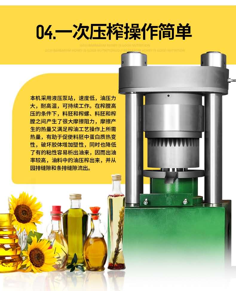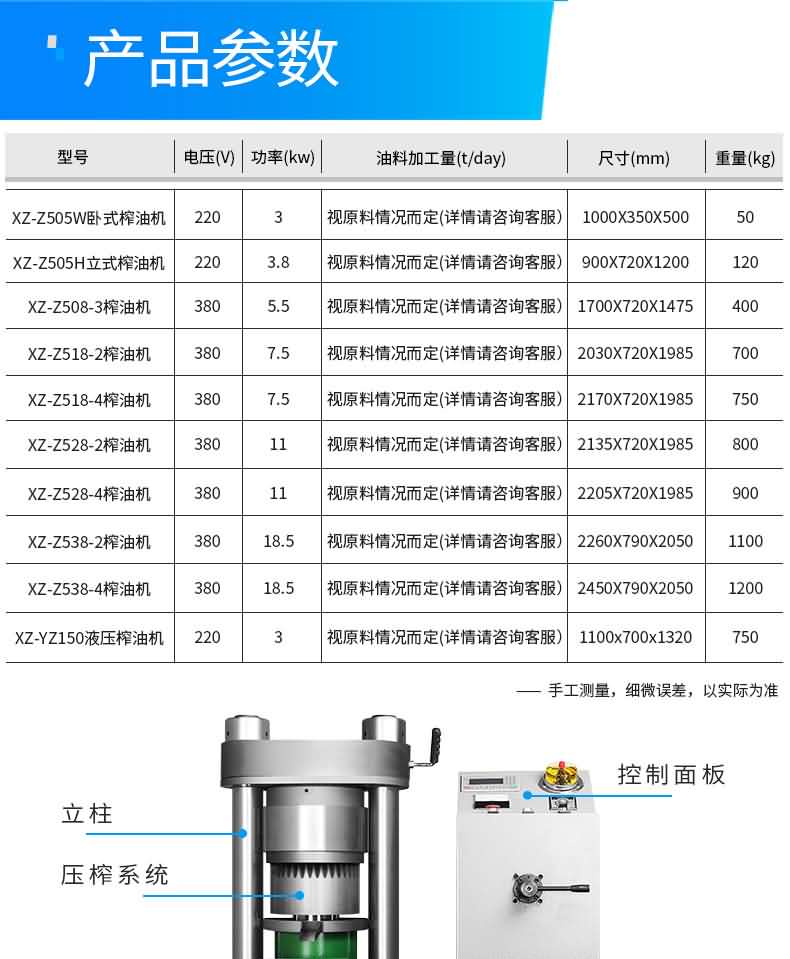 名稱XZ-YZ150液壓榨油機(jī) 電源220V 功率3kw 產(chǎn)量 尺寸1100×700×1320mm 重量750kg 規(guī)格 其他