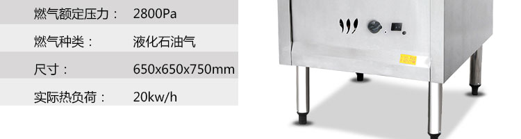 名稱蒸包爐 電源220V 功率20kw 產(chǎn)量 尺寸650×650×750mm 重量25kg 規(guī)格 其他燃?xì)夥N類:液化石油氣;燃?xì)忸~定壓力:2800Pa