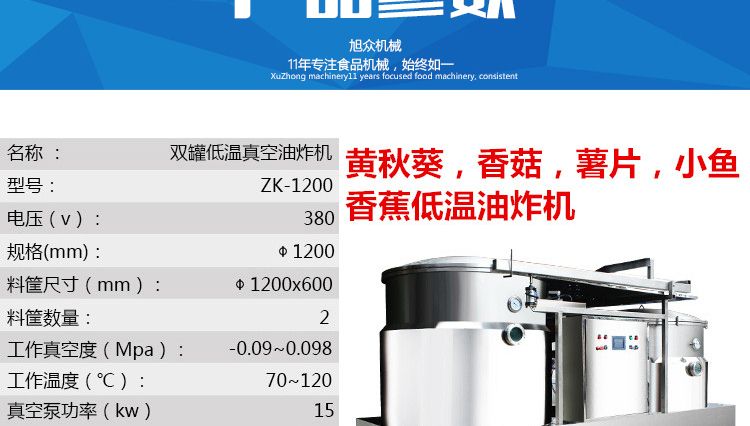 ZK-1200真空油炸機(jī),適用于水果類、蔬菜類、干果類、水產(chǎn)品機(jī)畜禽肉類等。油炸食品不易褪色、褐色,可以保持原料本身的顏色